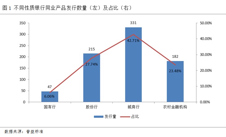 城商行是最大的发行主体。根据普益标准的统计数据显示,2017年7月16日至31日各大银行共发行775款同业产品,其中只面向同业发行的有735款,同时面向机构和同业的有40款。按照发行银行的类别来看,城商行发行量最多,为331款,占比42.71%;其次是股份行和农村金融机构,分别发行215款和182款,二者合计共占51.22%;国有行发行量最少,有47款,占比6.06%(见图1)。对比几个统计期可以发现:城商行同业产品的发行量一直最多,而国有行的发行量则一直最少。