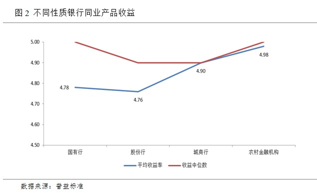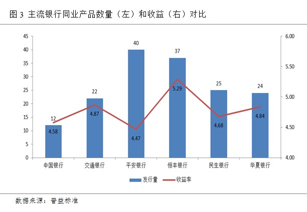 主流银行间同业理财产品收益相差较大。由于全国性银行的同业理财产品收益率是所有机构参考的标尺,产品发行数量较少的银行平均收益容易受极端值影响,不具有代表性,因此根据统计区间各个银行发行的产品情况,我们选取中国银行、交通银行、平安银行、恒丰银行、民生银行和华夏银行作为参考分析主流银行间同业理财产品收益情况。整体来看,主流银行的同业产品收益较高,除平安银行略低于4.5%,为4.47%,其他五家银行均在4.5%以上,但不同银行的同业产品收益相差较大,从图3可以看出,恒丰银行在统计期内发行了37款同业理财产品,平均收益达到了5.29%,而平安银行的同业理财产品平均收益只有4.47%。可见,主流银行间同业理财收益不存在一定的规律,主要受各银行理财业务重点和投研能力的影响。