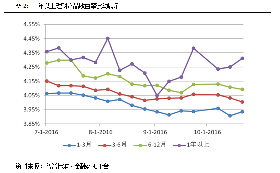 在图1中,非保本与保本类理财产品均表现出长期限产品收益率波动明显大于短期限产品的现象。这种波动剧烈的情况主要由两个因素造成。首先,长期限理财产品发行量较少,导致这类产品平均值易受到个别异常值影响。另一方面,长期限产品由于收益率锁定难度较大、投资标的差异较大等问题促使定价较为困难,在加上产品发行频率低、发行数量少等原因,最终导致整体收益率波动显得更为剧烈。下图则展示了,相对一年期以下产品,一年期以上产品波动极为剧烈,在三季度峰值为4.45%,谷值为4.05%,差值达40个BP。