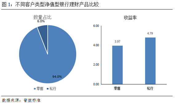 按照投资者财富数量多寡和风险承担能力的不同,将个人客户类型分为零售客户和私人银行客户。从2017年1-4月份存续的净值型理财来看,面向零售客户发行的产品数量占绝对优势,在所有的净值型银行理财产品中零售客户占比高达94 %;而私人银行客户占比仅为6%。