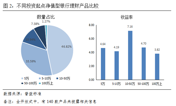 为查看投资规模对银行净值型产品收益的影响,我们将产品按照投资起点做进一步细分,结果如下图2所示。从图中我们可以看出,净值型银行理财产品投资起点在5万、5-10万的最多,占比分别为46.82%、33.59%;投资起点在10-50 万、50-100万产品数量相对较少,合计占比为18.32%,而产品数量最少的100万以上的产品,占比仅有1.27%