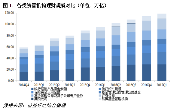 整体来看,资管市场的资产规模一直保持递增趋势,增幅变化差异不大。分机构看,近年来银行理财规模始终排名首位,其次是信托资管;截至2017年1季度,银行和信托合计资产规模占比突破50%,共同占据资管市场的半壁江山。保险、基金和券商资管发展基本同步,处于中等水平,只是随着竞争的加剧和金融风险的复杂化,基金和券商在资金运作上的比较优势正逐渐拉开其与保险资管之间的差距。此外,公募和私募基金目前的市场份额较小,资产规模低于10万亿;与此同时,期货公司的资管业务还处于发展的初级阶段。