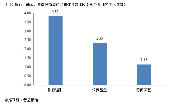 从图2来看,截至3月,券商资管产品平均年化收益最高、公募基金次之、净值型银行理财平均年化收益较低;截至4月,净值型银行理财平均年化收益最高、公募基金次之、券商资管产品平均年化收益最低;截至5月,同样是净值型银行理财平均年化收益最高、公募基金次之、券商资管产品平均年化收益最低。因此总体来看,截至2017年5月,净值型银行理财产品收益变化幅度小,且总体收益表现高于基金和券商资管相应产品;券商资管净值型产品收益变化幅度大,且收益较低;公募基金产品总体适中。另外从基础资产看,银行理财产品投资范围广,既可投固收类与权益类,还可投非标类与特定目的载体;而基金与券商集合理财产品一般都是按照所投资产比例大小确定类型。因此,为使比较更具科学性,还需对不同类型产品收益分别进行细致分析。