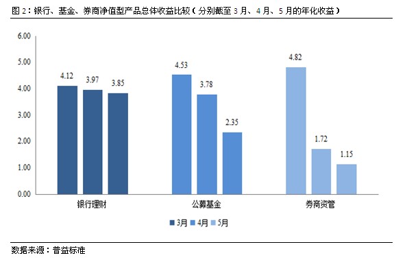 上述结果表明,若从2017年初开始投资,截至5月,相对于公募基金产品和券商资管产品,净值型银行理财产品的收益相对更高。为避免单一年化收益的误导性,又分别计算了截至3月、4月、5月三种净值型产品各自的年化收益率。