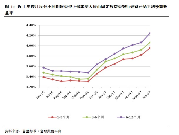6月保本型人民币固定收益类理财产品的平均预期收益率为4.06%,较5月上升16个BP。其中,1个月以下期限类型产品收益率为3.68%;1-3个月期限类型产品的平均预期收益率为3.96%,环比上升14个BP,3-6个月期限类型产品的平均预期收益率为4.06%,较上月上升了14个BP;6-12个月期限类型产品的平均预期收益率为4.24%,环比上升18个BP;一年以上期限类型产品平均收益率为4.50%,环比上升了32个BP。