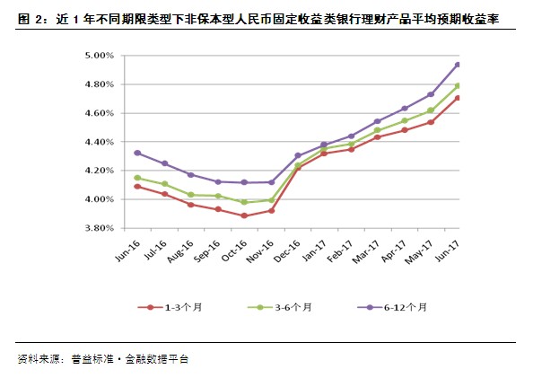 6月非保本型人民币固定收益类理财产品的平均预期收益率为4.79%,环比上升18个BP。其中,1个月(含)以下期限类型产品的平均预期收益率为4.85%;1-3个月期限类型产品的平均预期收益率为4.71%,环比上升17个BP;3-6个月期限类型产品的平均预期收益率为4.79%,环比上升17个BP;6-12个月期限类型产品的平均预期收益率为4.94%,环比上升21个BP;1年以上期限类型产品的平均预期收益率为5.02%,环比上升19个BP。