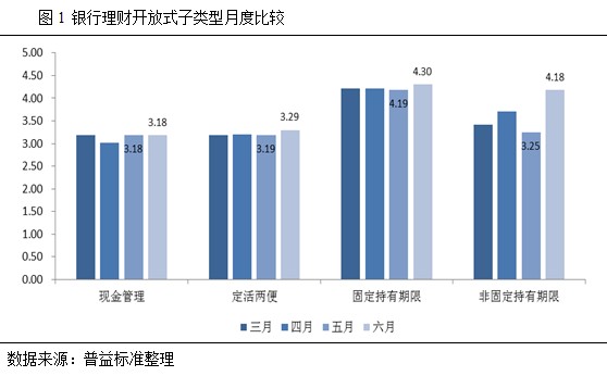 开放式产品各子类型收益普涨。对比3-6月在售的开放式产品收益可以发现:6月全开放产品中的现金管理型收益相比5月未发生变化,定活两便型收益环比上升10BP;半开放产品中的固定持有期限型收益环比上升11BP,而非固定持有期限型收益水平增加最为明显,环比上升93BP。