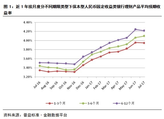 7月保本型人民币固定收益类理财产品的平均预期收益率为4.06%,环比持平。其中,1个月以下期限类型产品收益率为3.43%;1-3个月期限类型产品的平均预期收益率为3.95%,环比下降1个BP,3-6个月期限类型产品的平均预期收益率为4.10%,较上月上升了4个BP;6-12个月期限类型产品的平均预期收益率为4.22%,环比下降2个BP;一年以上期限类型产品平均收益率为4.47%,环比下降3个BP。
