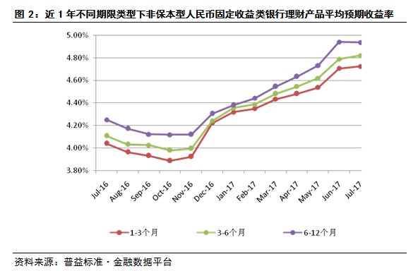 7月非保本型人民币固定收益类理财产品的平均预期收益率为4.81%,环比6月上升2个BP。其中,1个月(含)以下期限类型产品的平均预期收益率为4.87%;1-3个月期限类型产品的平均预期收益率为4.72%,环比上升1个BP;3-6个月期限类型产品的平均预期收益率为4.82%,环比上升3个BP;6-12个月期限类型产品的平均预期收益率为4.93%,环比下降1个BP;1年以上期限类型产品的平均预期收益率为5.00%,环比下降2个BP。