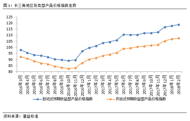 从价格指数来看,2月,长三角地区银行理财市场价格指数继续上升,环比上涨0.74点至114.18点,涨幅为0.65%。其中,封闭式预期收益型产品价格指数环比上涨0.79点至118.60点;开放式预期收益型产品价格指数环比上涨0.67点至107.55点。2018年,市场预期资金偏紧的可能性较大,促使各金融机构融资成本居高不下,银行理财收益也随之上涨。但在严监管背景下,银行理财收益大幅上涨可能性仍较低。