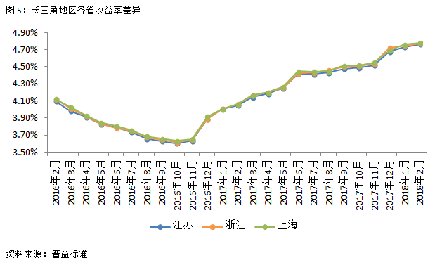 从收益表现来看,江苏、浙江、上海三个地区的银行理财收益均有所上涨。其中,江苏省银行理财收益上涨3BP,为4.76%;浙江省银行理财收益上涨2BP,为4.77%;上海地区银行理财收益上涨2BP,为4.78%。各省份银行理财收益继续上涨,反映各地区资金需求仍十分强烈。