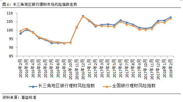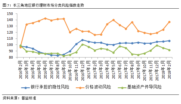 从风险指数来看,本月长三角地区银行理财风险指数增速有所上升,环比上涨1.91点至107.63点,风险水平有一定程度上涨。2月,债市持续平稳上涨,表现良好,促使银行理财市场基础资产传导风险进一步下跌。由于资管新规公布在即,打破刚兑、实行净值化管理、消除多层嵌套等对银行理财产品冲击较大,这也使得价格波动风险有一定程度的上涨。随着全国两会召开,3月银行理财市场风险水平有望得到抑制。