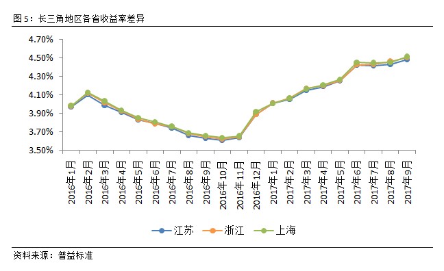 长三角各省银行理财收益涨幅进一步扩大。9月,长三角地区各省银行理财收益进一步上涨。一方面,全国金融工作会议结束后,银监会深入贯彻会议精神,调训监管中坚力量,监管进一步收严,市场流动性压力不减;另一方面,由于处于季度末月,市场资金面趋紧,各银行为了争夺资金,成本难以下降。10月中旬将迎来党的十九大,各地区将维持稳定的状态,预计各省收益涨幅将有所回落,但上涨趋势不改变。