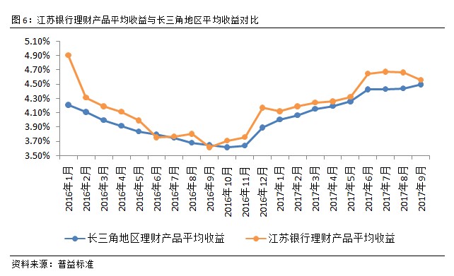 江苏银行理财收益趋向稳健,仍领先地区水平。从江苏银行理财产品的平均收益来看,9月江苏银行理财产品平均收益与长三角地区理财产品平均收益进一步趋近,但江苏银行理财收益水平仍领先地区水平。从理财收益的走势来看,江苏银行采取了更加稳健的策略,这主要是受监管收严的影响,做好风险防范工作,适时调整业务节奏成为江苏银行近期工作的重点,这也符合监管层近期所提出的将金融安全放在首位的指导方针。
