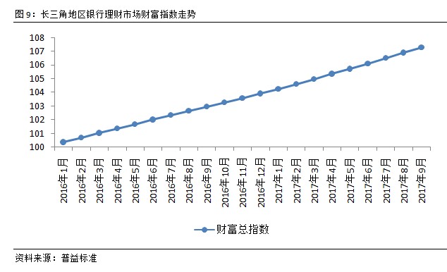长三角地区银行理财财富指数平稳上升。由于银行理财通常以预期收益的形式发行,因此收益与时间呈现正相关关系。由图可见,长三角地区银行理财市场财富指数随时间推移持续上行,仅有单月增幅差异的变化。2017年9月,长三角地区财富指数涨幅较8月略有扩大,环比上涨0.40点至107.29点。财富指数平稳上升,长三角地区财富稳定累积。