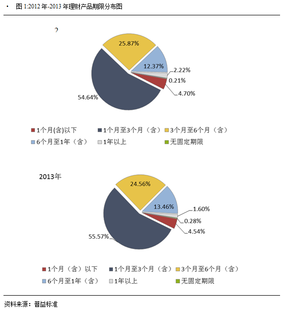 在此阶段银行理财产品的流动性虽有明显提升,但仍以具有封闭期的预期收益型产品为主,超高流动性产品(开放式产品)仍处于萌芽状态。从2012-2013年的产品分布图可以看到,开放式产品的占比没有明显提升,占比不足0.5%。