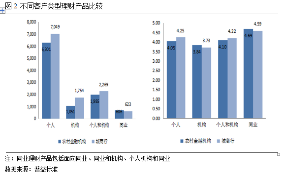 从客户类型来看,农村金融机构和城商行的相同点是:产品数量上,针对个人客户的理财产品为主;产品收益上,针对同业客户的理财产品最高。差异在于城商行面向个人的产品收益高于农村金融机构,而面向机构和同业客户的产品收益则低于农村金融机构,表明农村金融机构在吸引同业客户的做法上相对更激进。