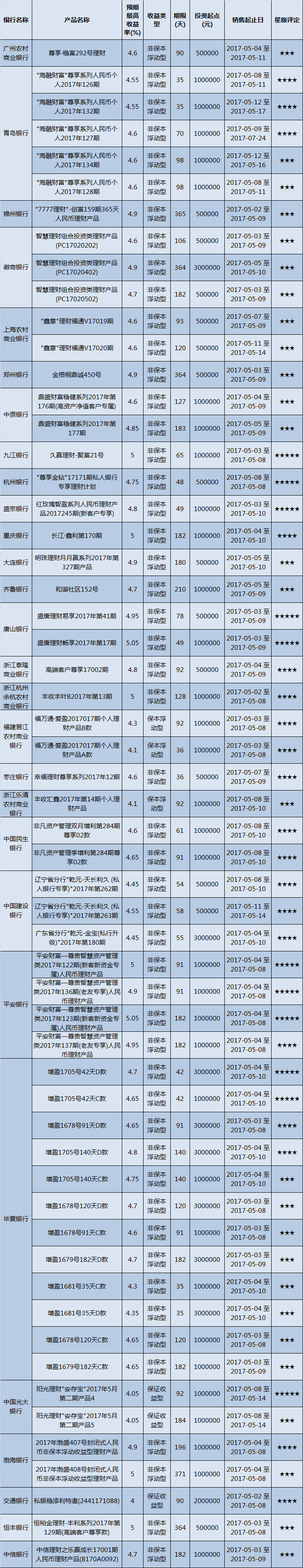 本周投资门槛在10万元以下的产品有1083款,平均预期收益为4.32%。其中有812款获得普益标准星级评定,平均预期收益率为4.43%。其中三星产品379款,平均预期收益率为4.33%;四星产品271款,平均预期收益率为4.46%;五星产品162款,平均预期收益率为4.60%。