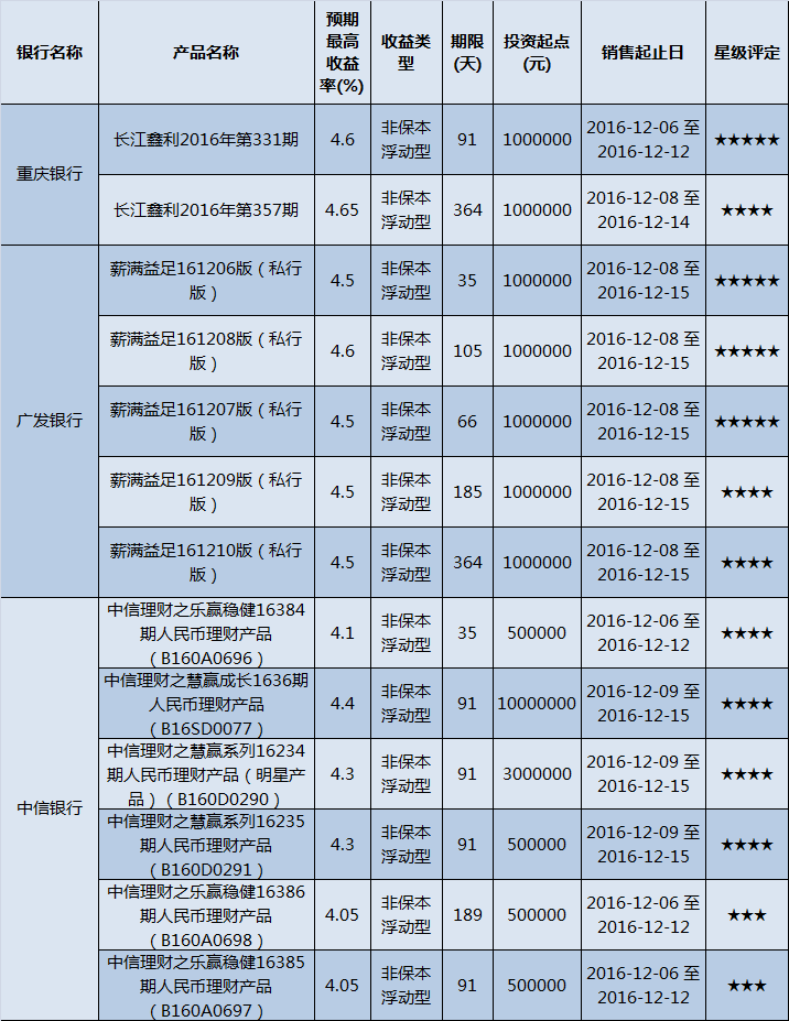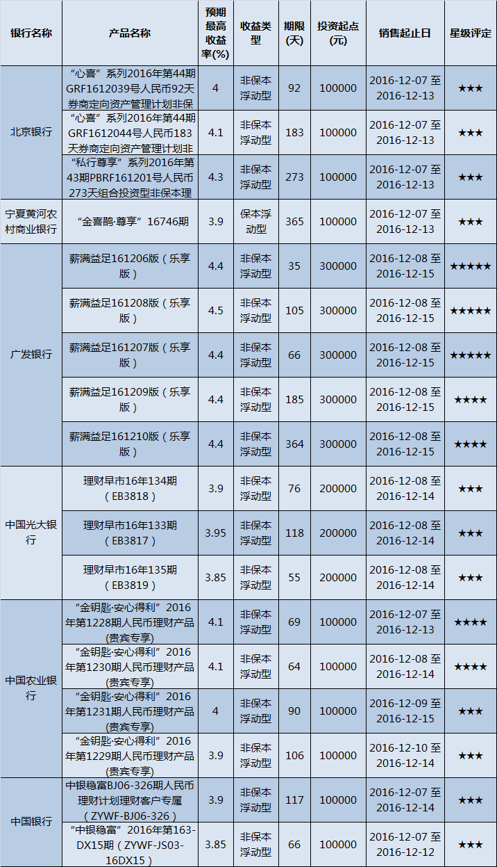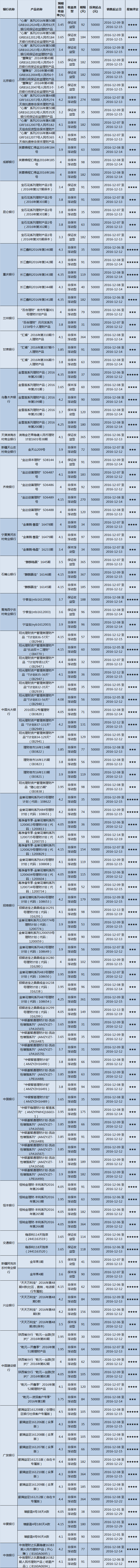 高门槛(50万元及以上)的理财产品中,西北地区有13款获得普益标准星级评定,平均预期收益率为4.39%。其中三星产品2款,平均预期收益率为4.05%;四星产品7款,预期收益率为4.39%;五星产品4款,预期收益率为4.55%。