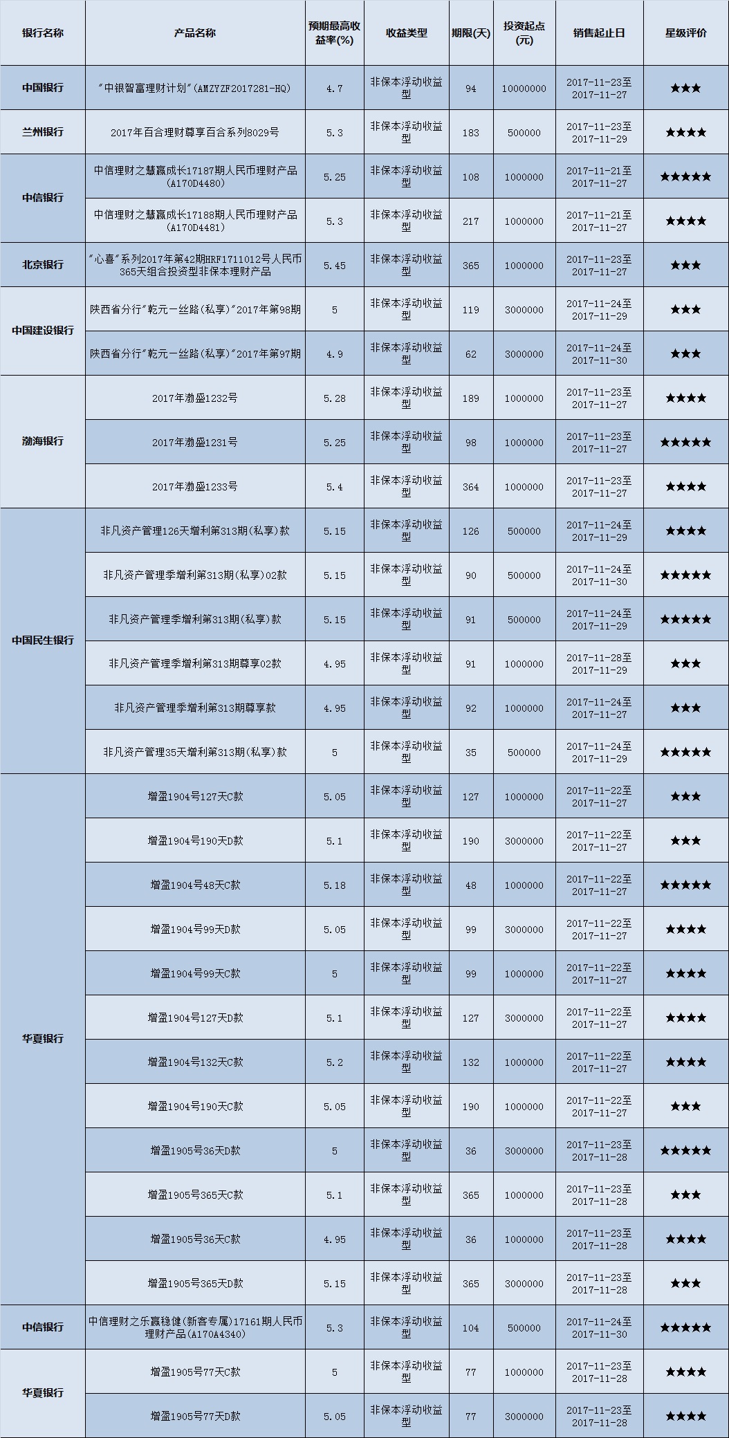 高门槛(50万元及以上)的理财产品中,西北地区有31款获得普益标准星级评定,平均预期收益率为5.11%。其中三星产品11款,平均预期收益率为5.04%;四星产品12款,平均预期收益率为5.15%;五星产品8款,平均预期收益率为5.16%。