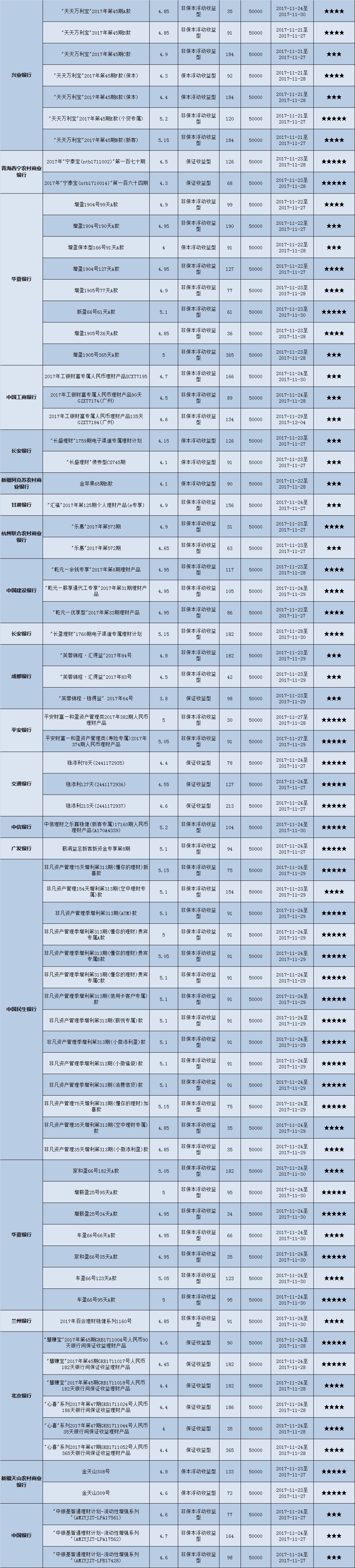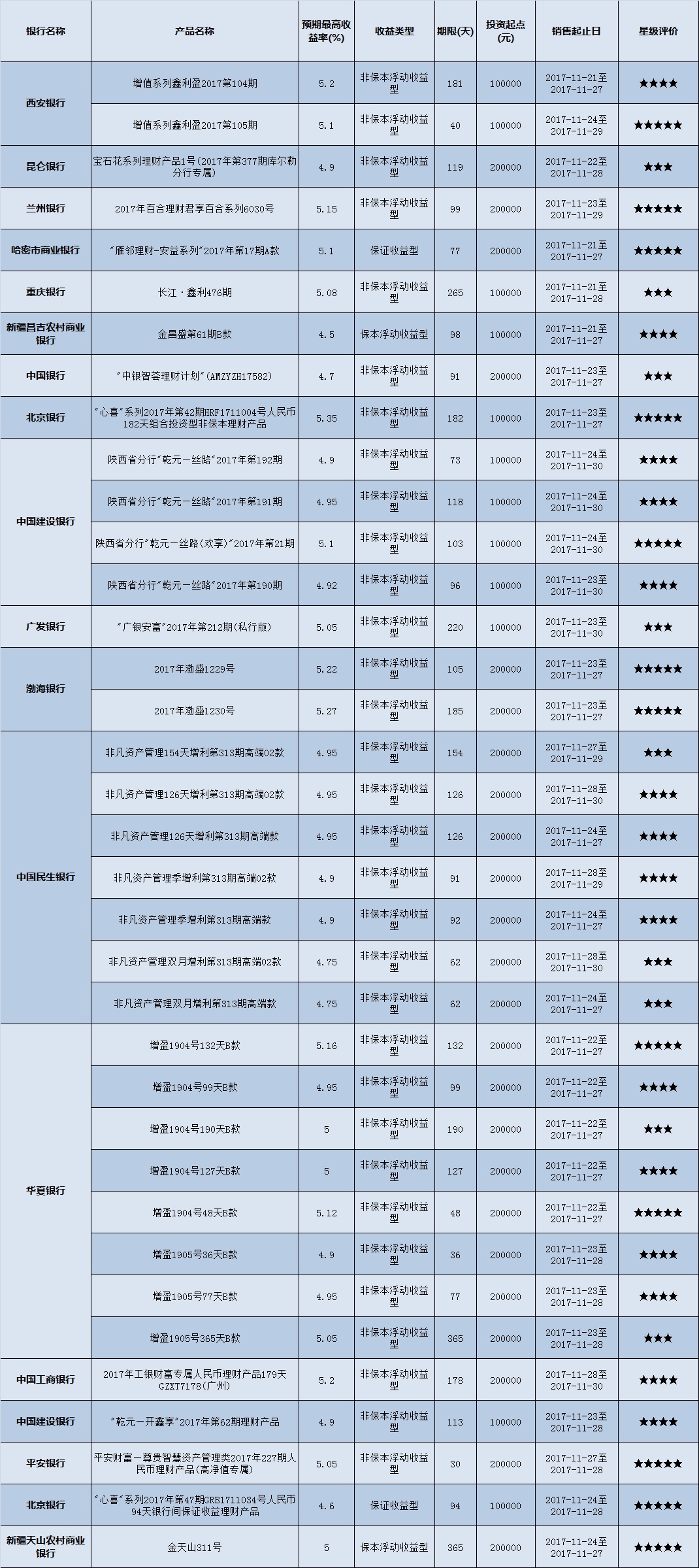 低门槛(10万元以下)理财产品中,西北地区有179款获得普益标准星级评定,平均预期收益率为4.79%。其中三星产品62款,平均预期收益率为4.62%;四星产品67款,平均预期收益率4.82%;五星产品50款,平均预期收益率为4.95%。