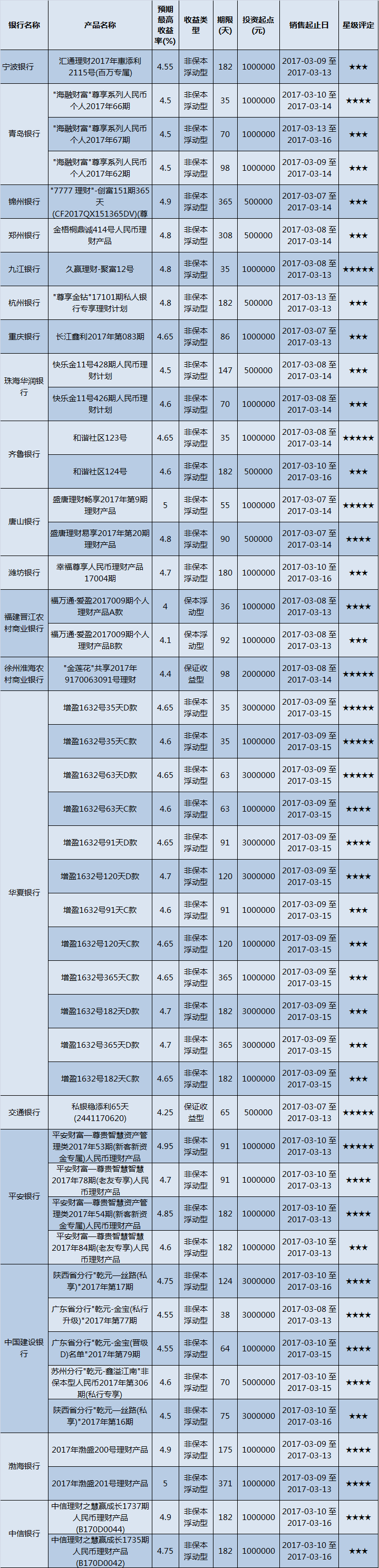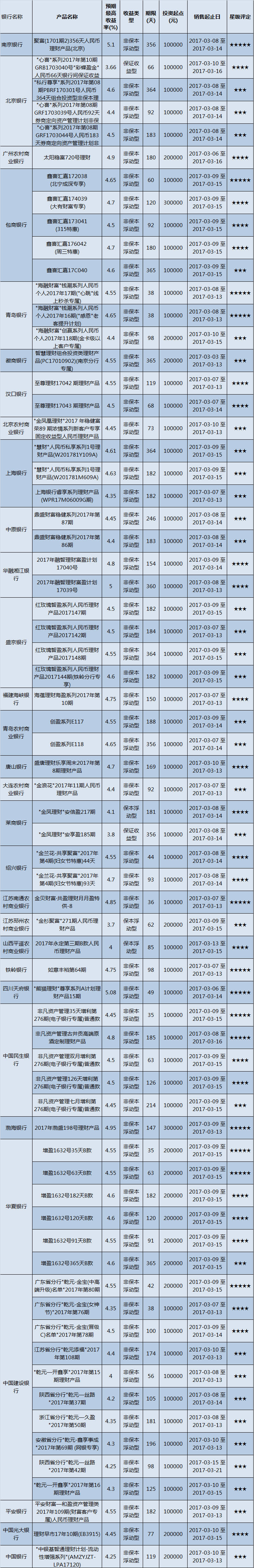 本周投资门槛在10万元至50万元(不含)的产品有91款,平均预期收益为4.42%。其中有68款获得普益标准星级评定,平均预期收益率为4.51%。其中三星产品32款,平均预期收益率为4.40%;四星产品23款,平均预期收益率为4.53%;五星产品13款,平均预期收益率为4.73%。