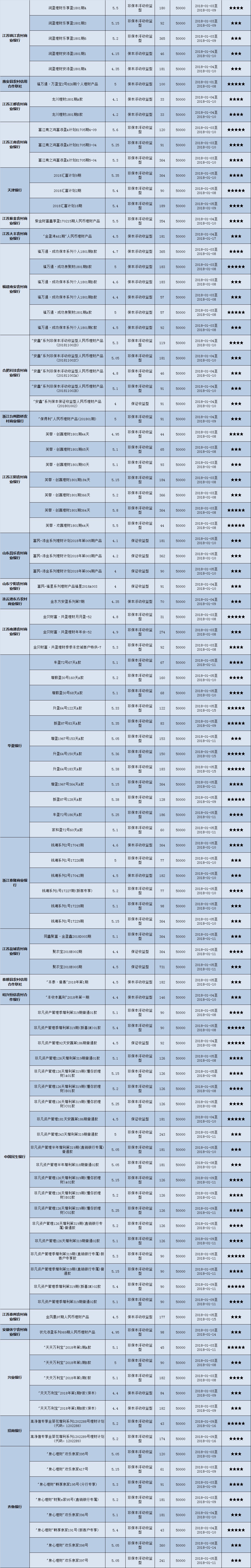 高门槛(50万元及以上)的理财产品中,华东地区有44款获得普益标准星级评定,平均预期收益率为5.16%。其中三星产品18款,平均预期收益率为5.1%;四星产品15款,平均预期收益率为5.06%;五星产品11款,平均预期收益率为5.38%。