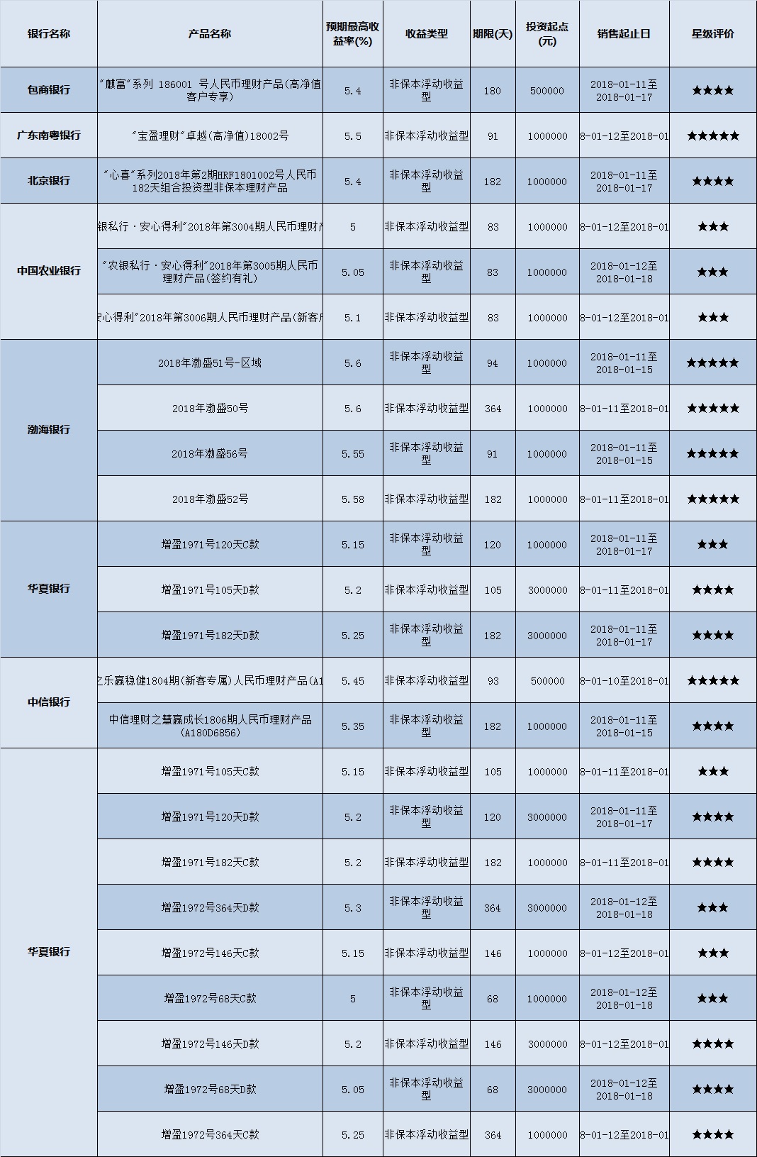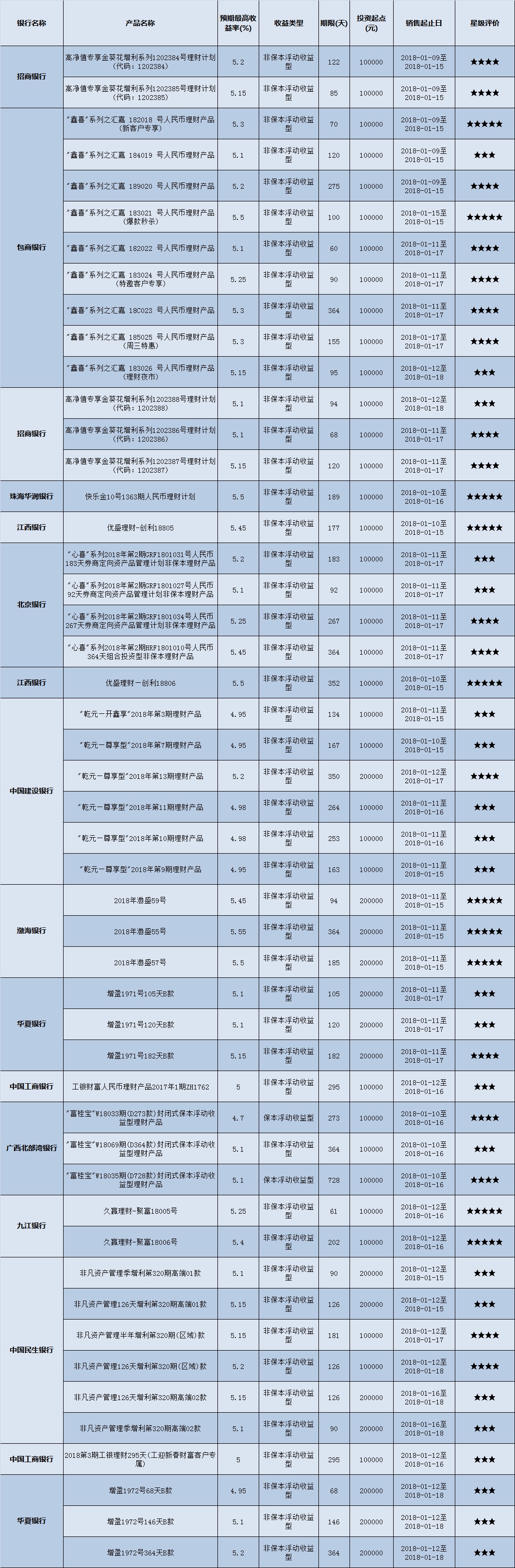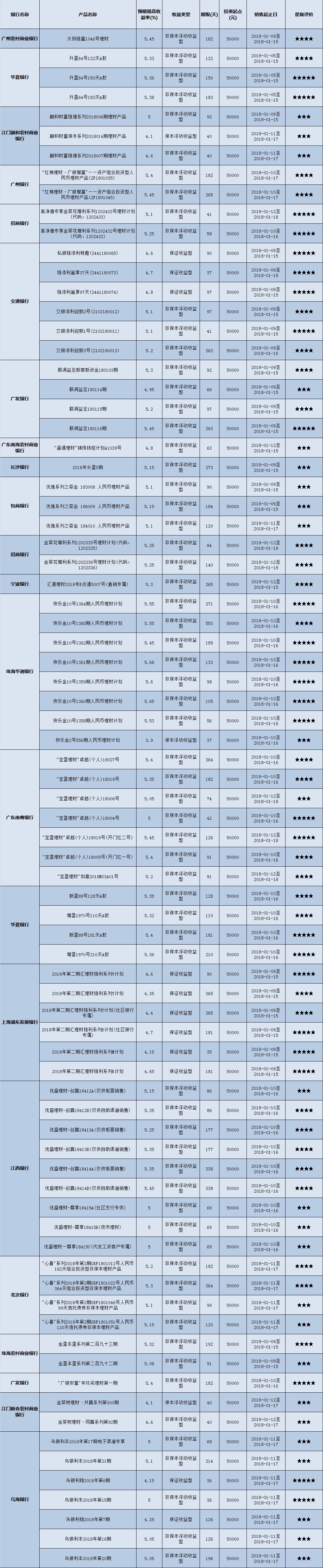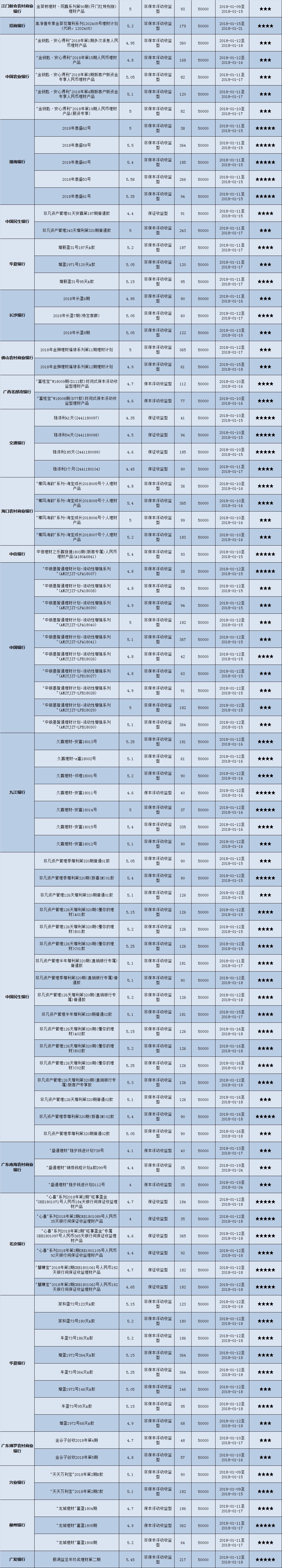 高门槛(50万元及以上)的理财产品中,华南地区有24款获得普益标准星级评价,平均预期收益率为5.28%。其中三星产品8款,平均预期收益率为5.11%;四星产品10款,平均预期收益率为5.25%;五星产品6款,平均预期收益率为5.55%。