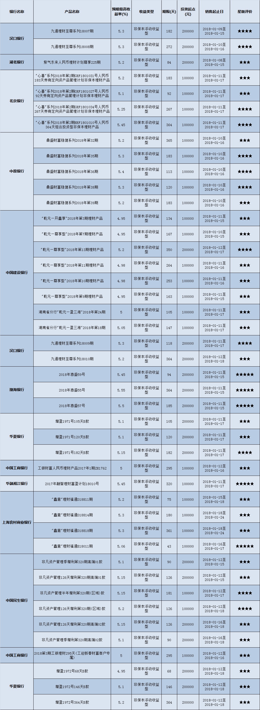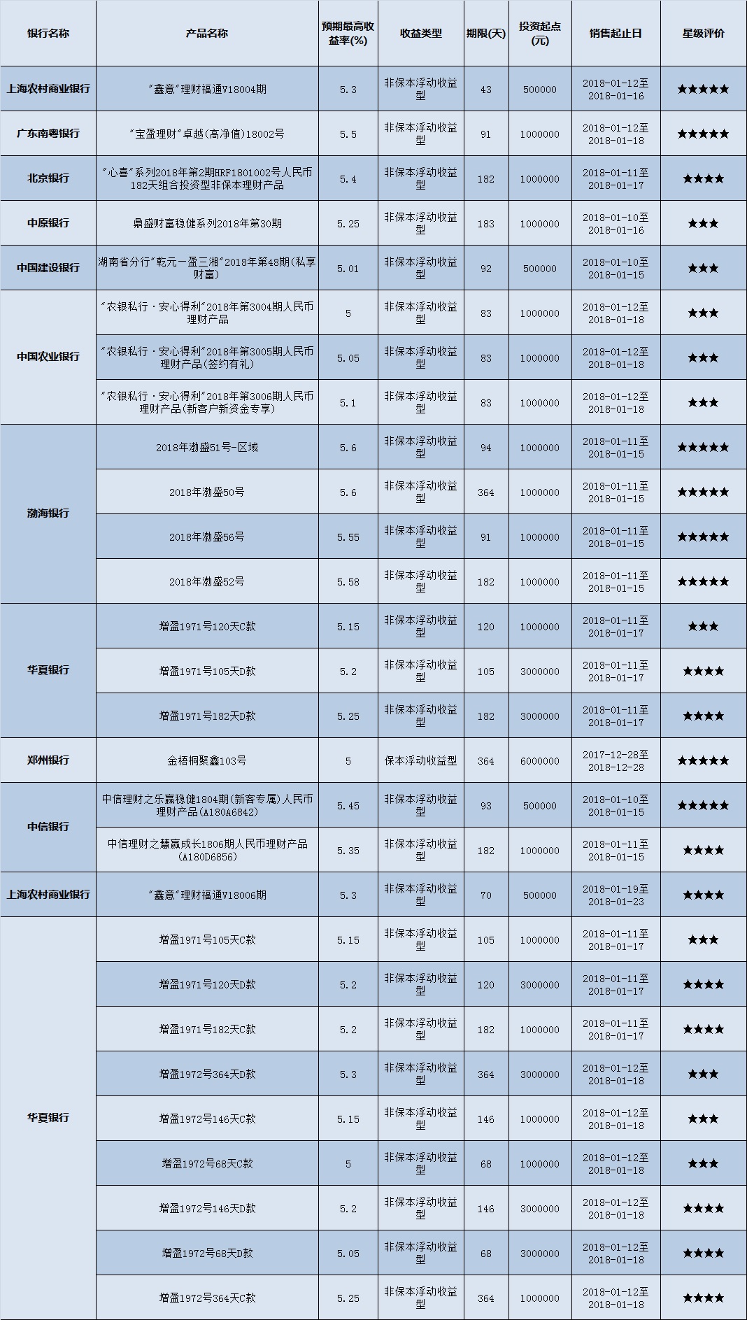 高门槛(50万元及以上)的理财产品中,华中地区有28款获得普益标准星级评价,平均预期收益率为5.25%。其中三星产品10款,平均预期收益率为5.12%;四星产品10款,平均预期收益率为5.24%;五星产品8款,平均预期收益率为5.45%。
