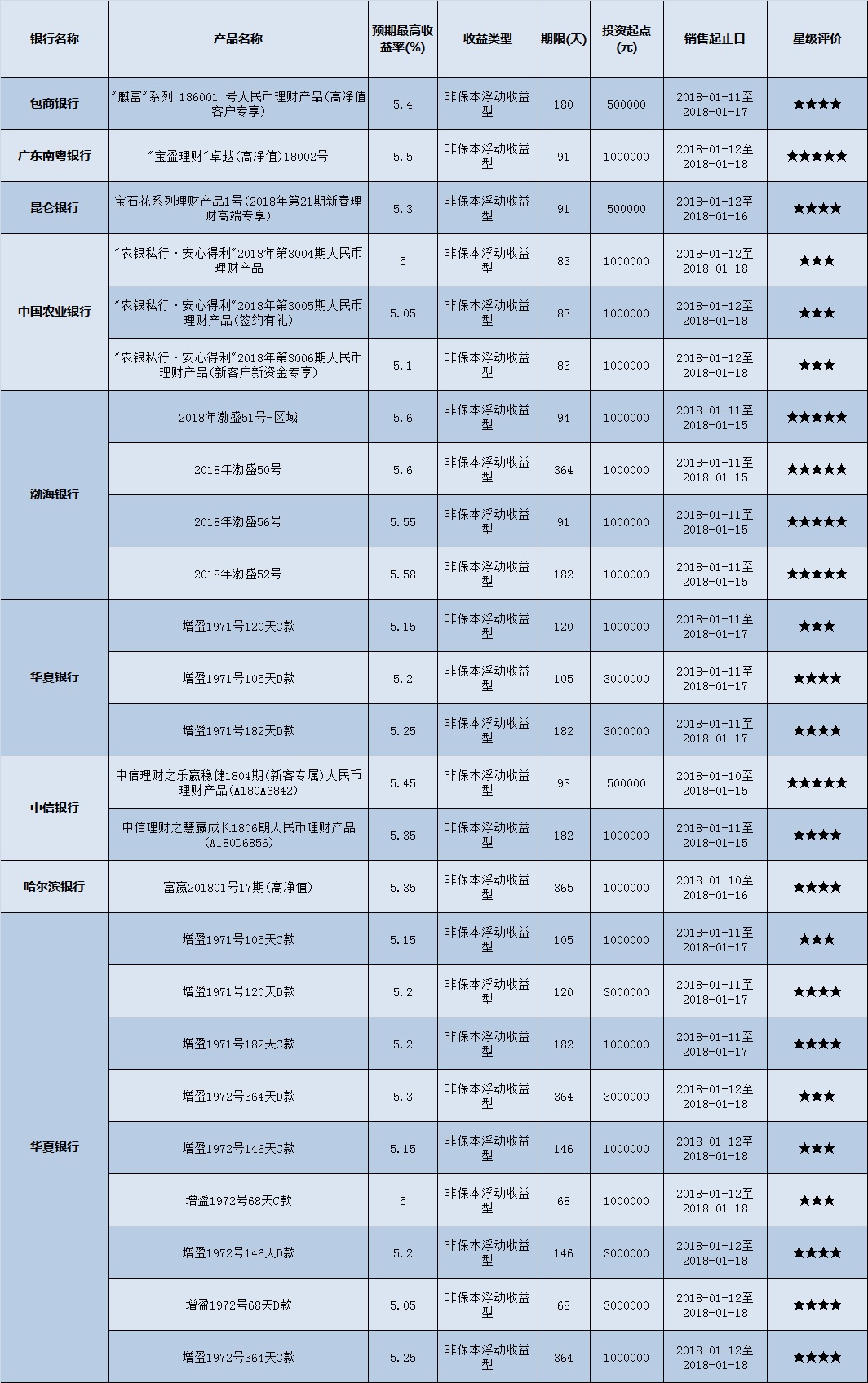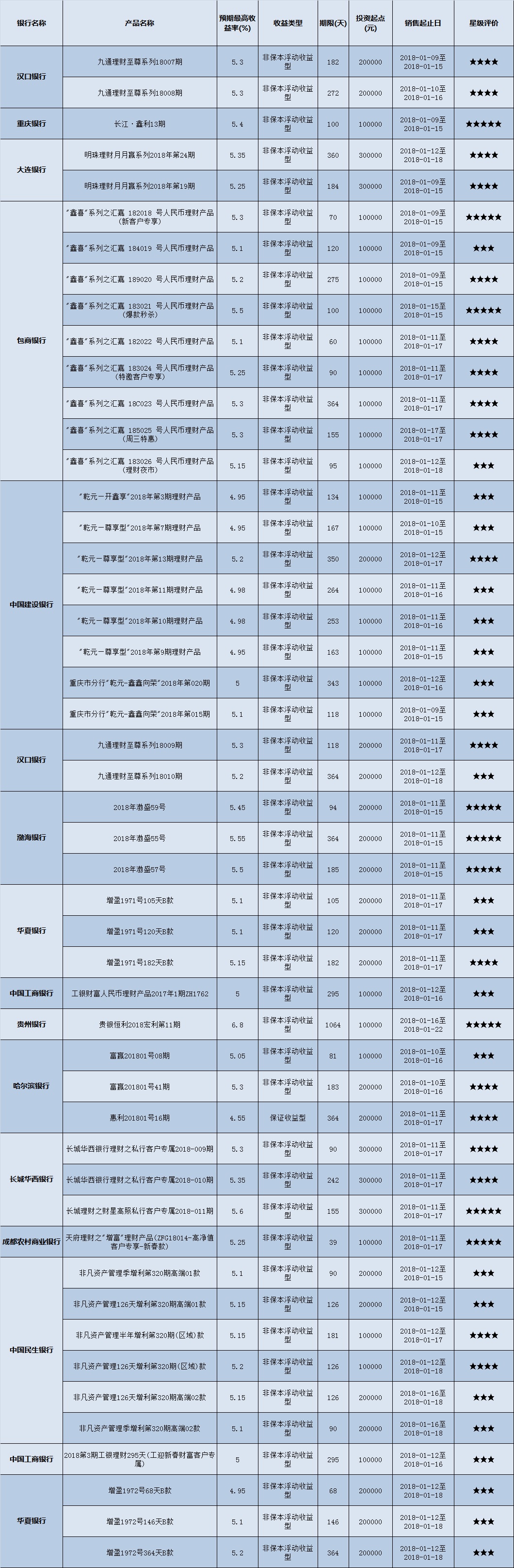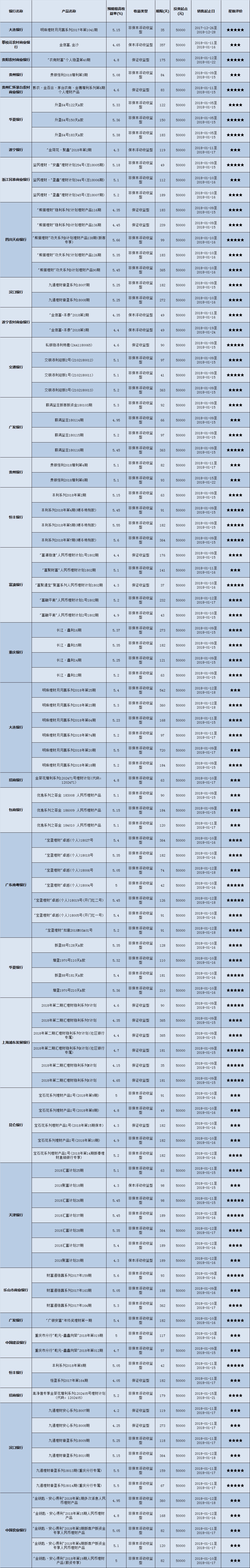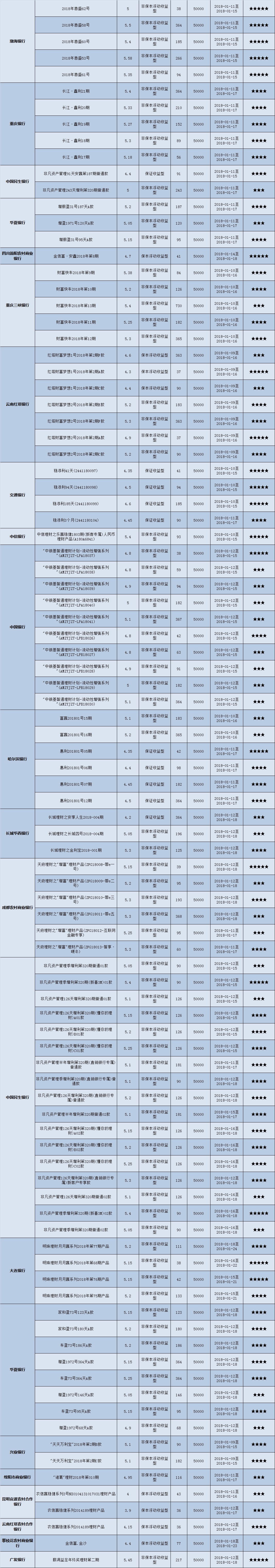 高门槛(50万元及以上)的理财产品中,西南地区有25款获得普益标准星级评价,平均预期收益率为5.28%。其中三星产品8款,平均预期收益率为5.11%;四星产品11款,平均预期收益率为5.25%;五星产品6款,平均预期收益率为5.55%。