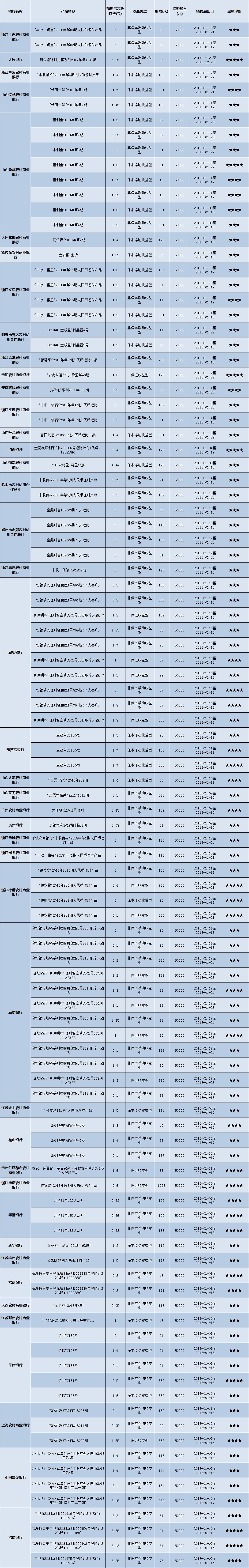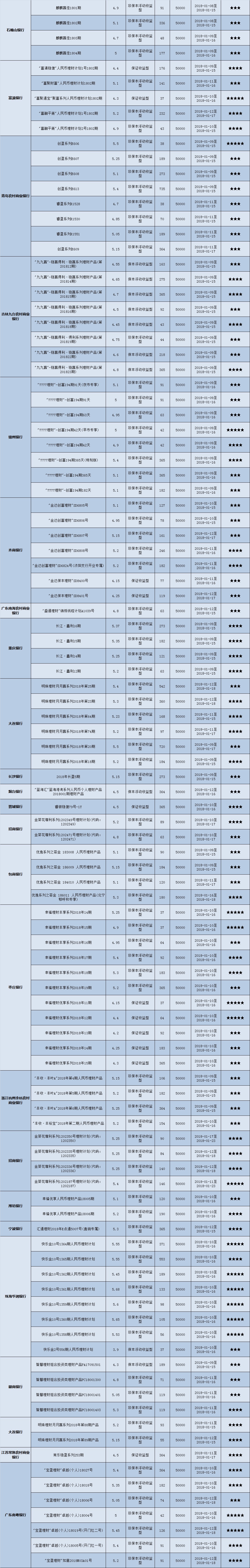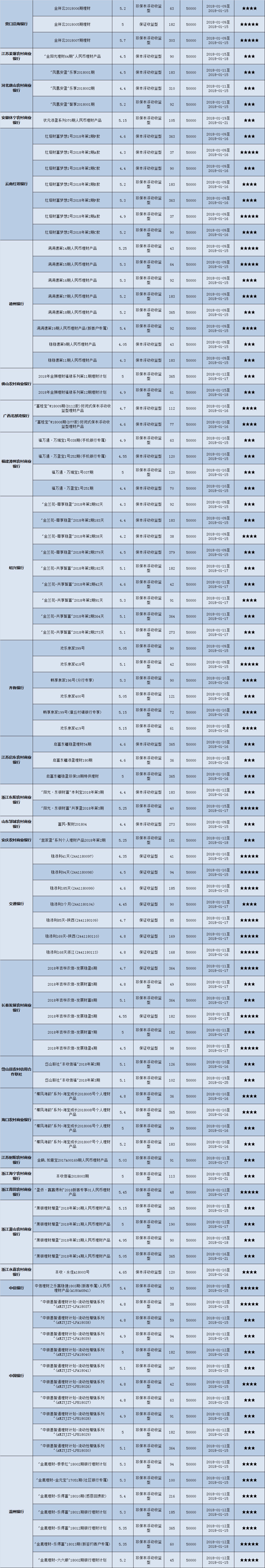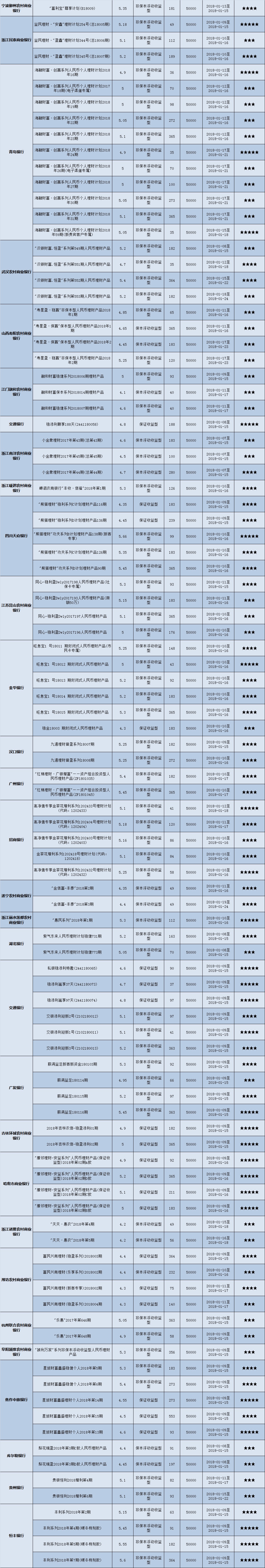 本周投资门槛在10万元以下的产品有1206款,平均预期收益为4.78%。其中有904款获得普益标准星级评价,平均预期收益率为4.95%。其中三星产品421款,平均预期收益率为4.82%;四星产品303款,平均预期收益率为5.05%;五星产品180款,平均预期收益率为5.07%。