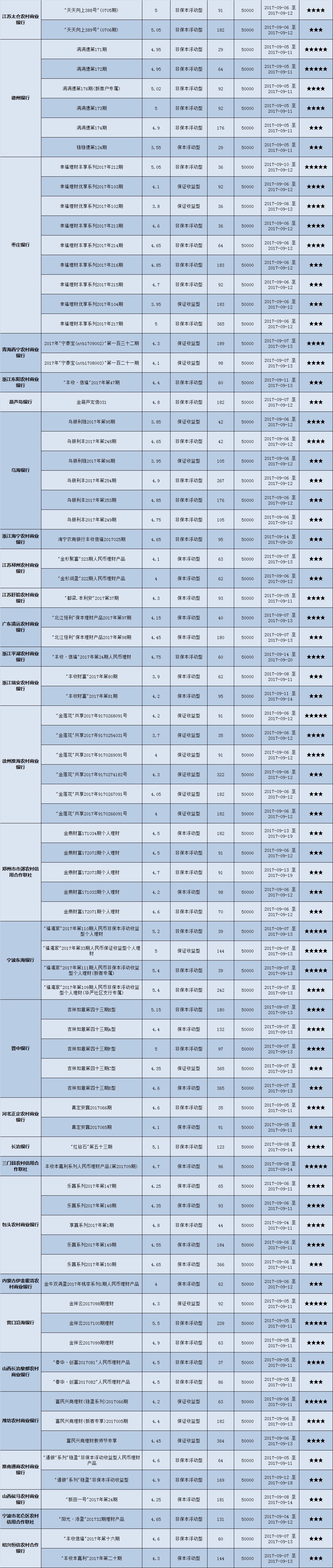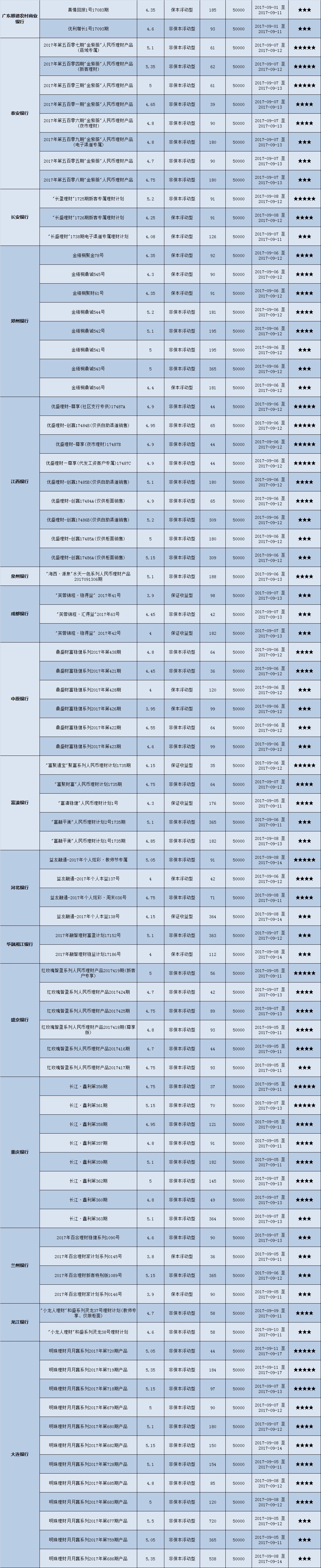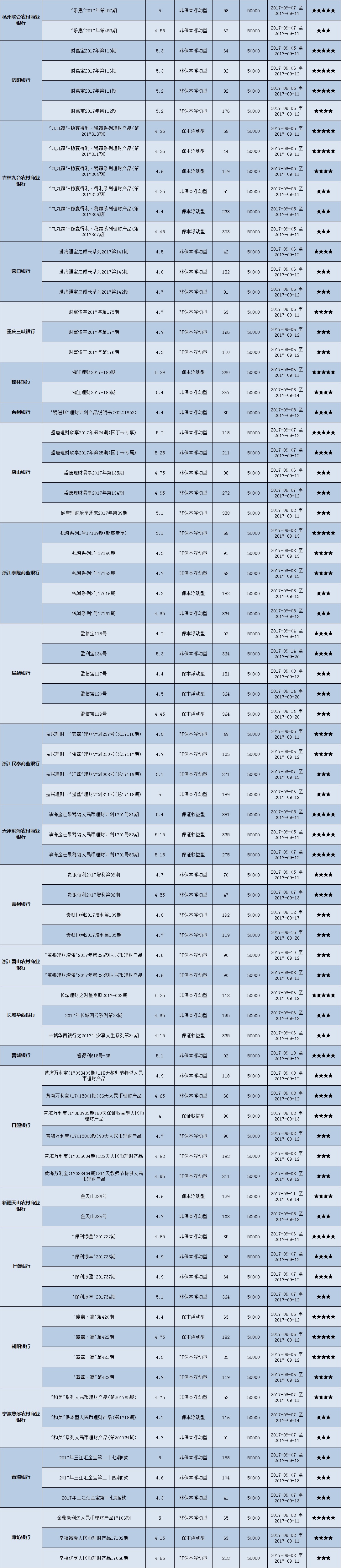 本周投资门槛在50万元及以上的产品有71款,平均预期收益为4.82%。其中有53款获得普益标准星级评定,平均预期收益率为4.96%。其中三星产品25款,平均预期收益率为4.96%;四星产品18款,平均预期收益率为4.93%;五星产品10款,平均预期收益率为5.01%。
