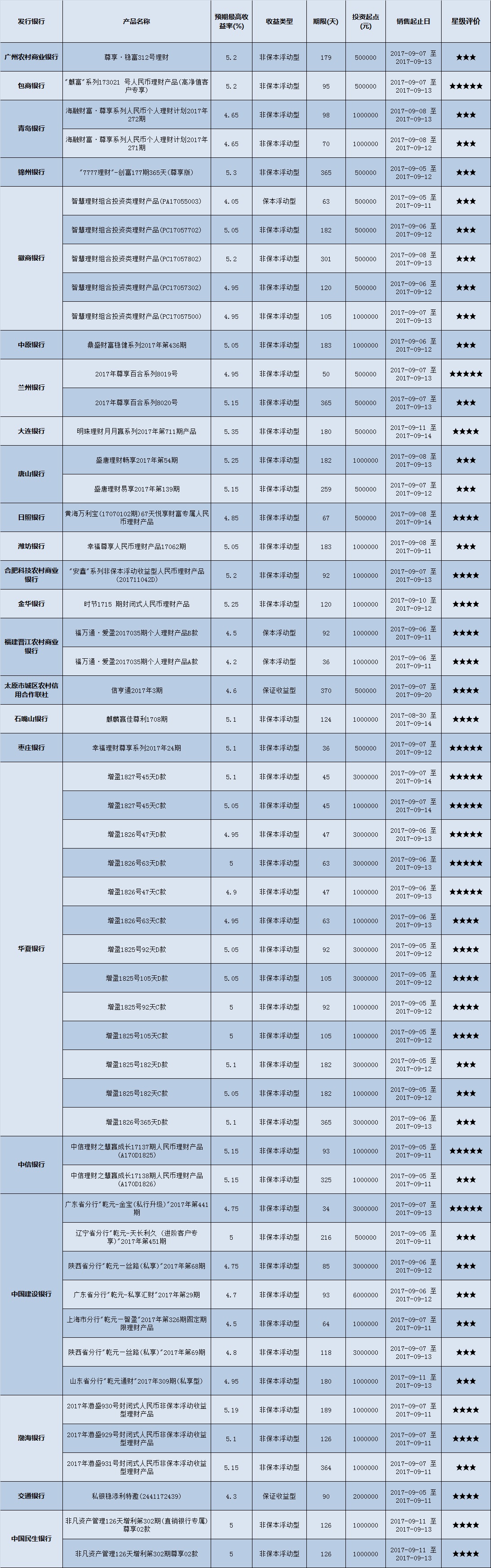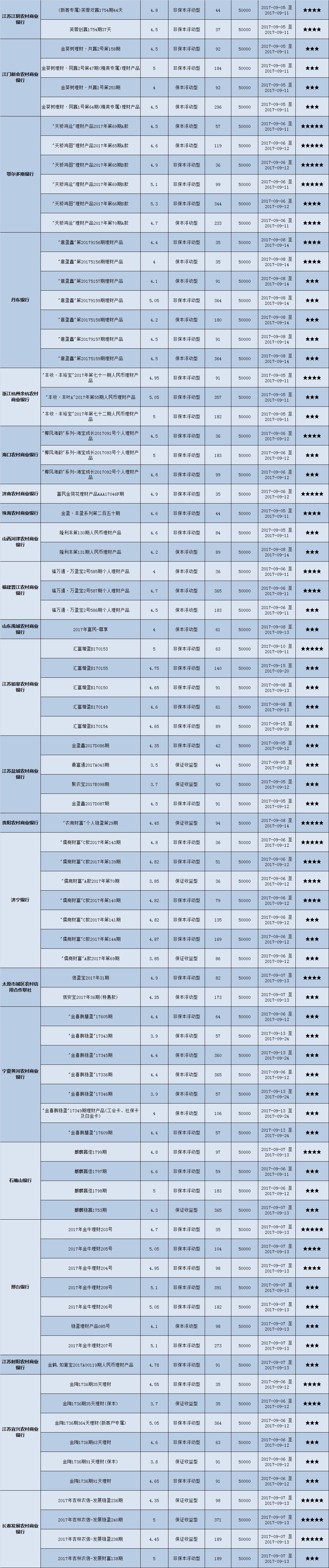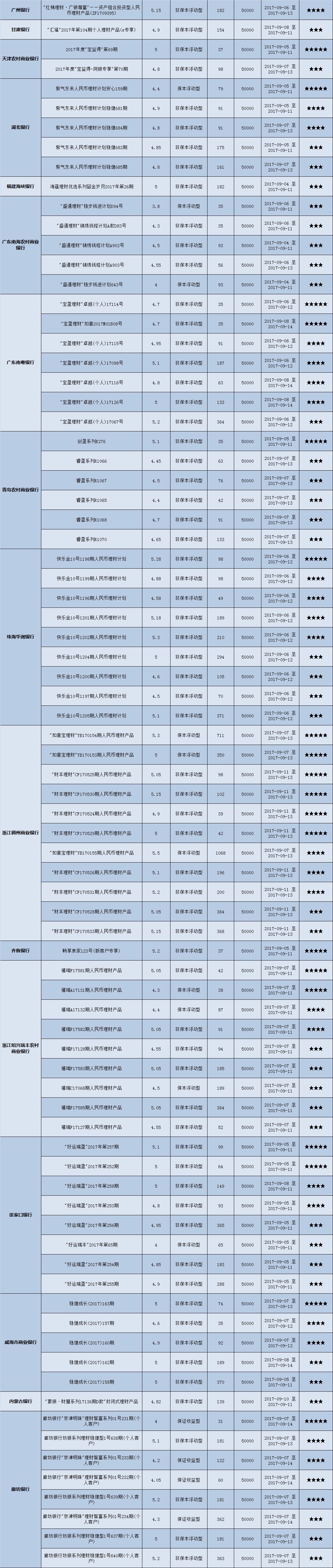 本周投资门槛在50万元及以上的产品有71款,平均预期收益为4.82%。其中有53款获得普益标准星级评定,平均预期收益率为4.96%。其中三星产品25款,平均预期收益率为4.96%;四星产品18款,平均预期收益率为4.93%;五星产品10款,平均预期收益率为5.01%。