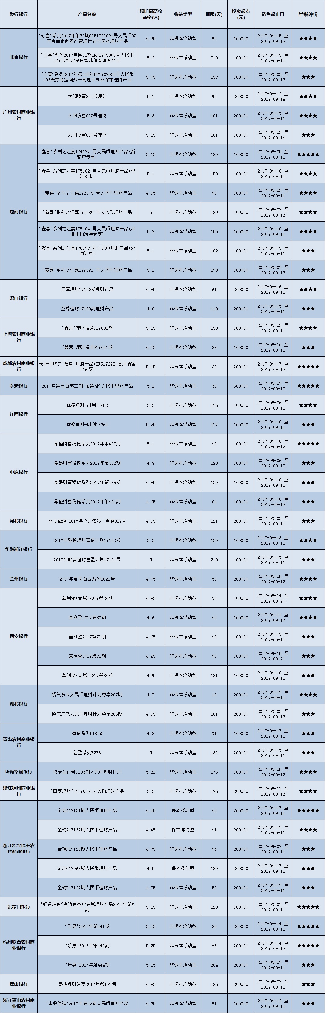 本周投资门槛在10万元以下的产品有1065款,平均预期收益为4.55%。其中有798款获得普益标准星级评定,平均预期收益率为4.67%。其中三星产品372款,平均预期收益率为4.59%;四星产品267款,平均预期收益率为4.66%;五星产品159款,平均预期收益率为4.86%。