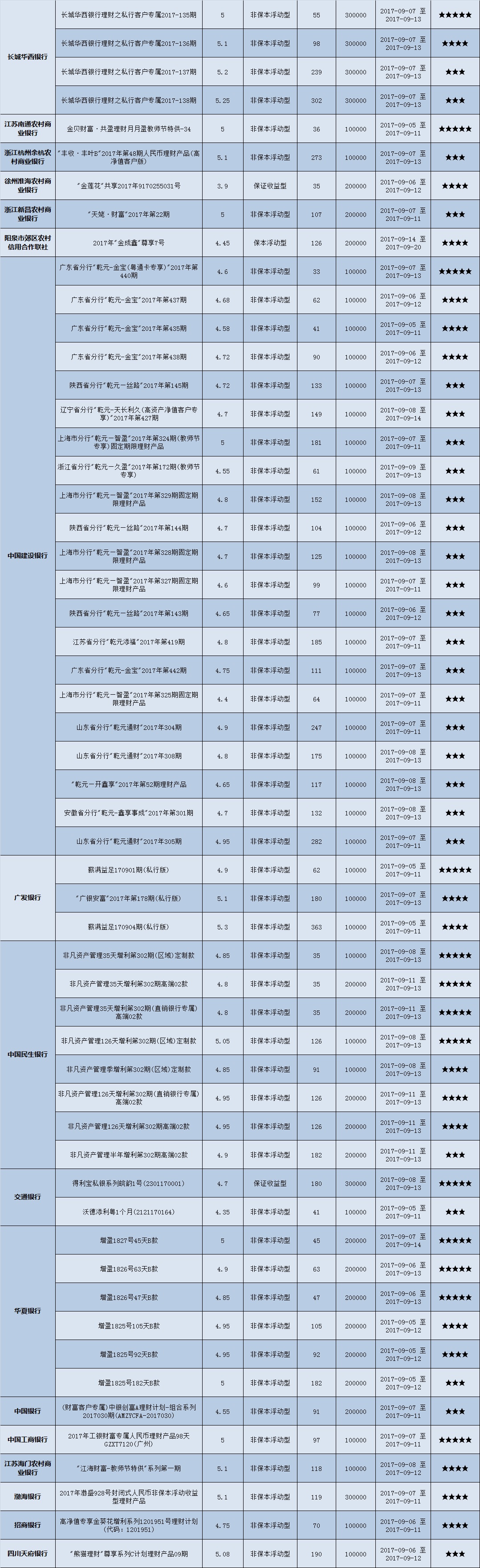 本周在售产品1278款,平均预期收益为4.60%。其中有957款获得普益标准星级评定,平均预期收益率为4.71%。其中三星产品447款,平均预期收益率为4.64%;四星产品320款,平均预期收益率为4.71%;五星产品190款,平均预期收益率为4.88%。