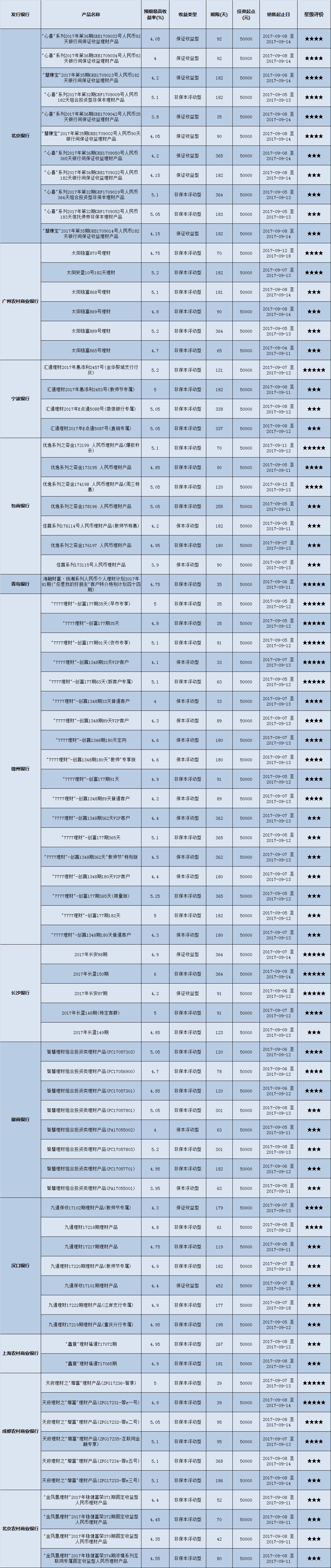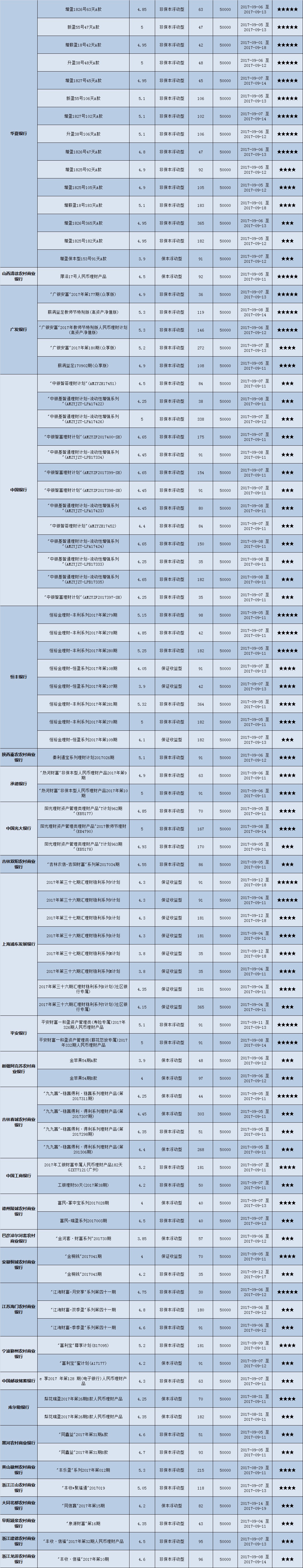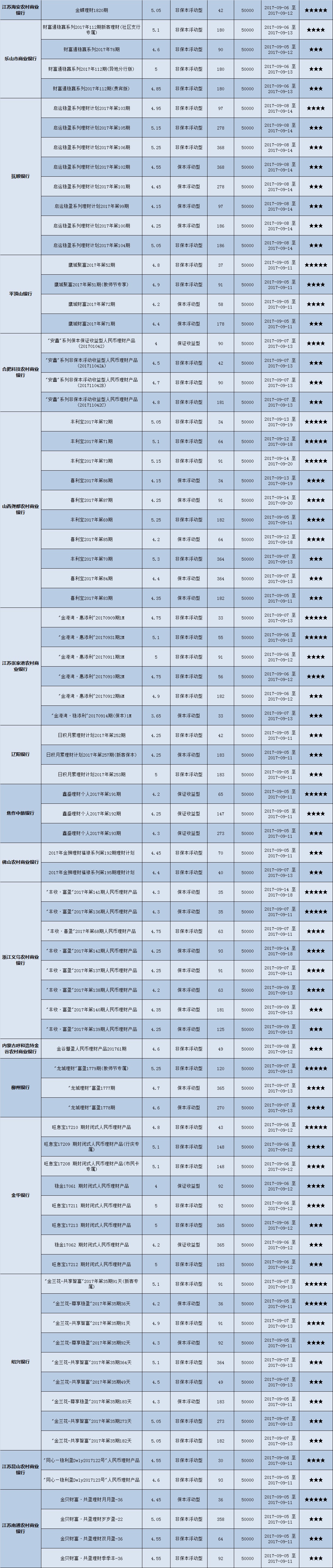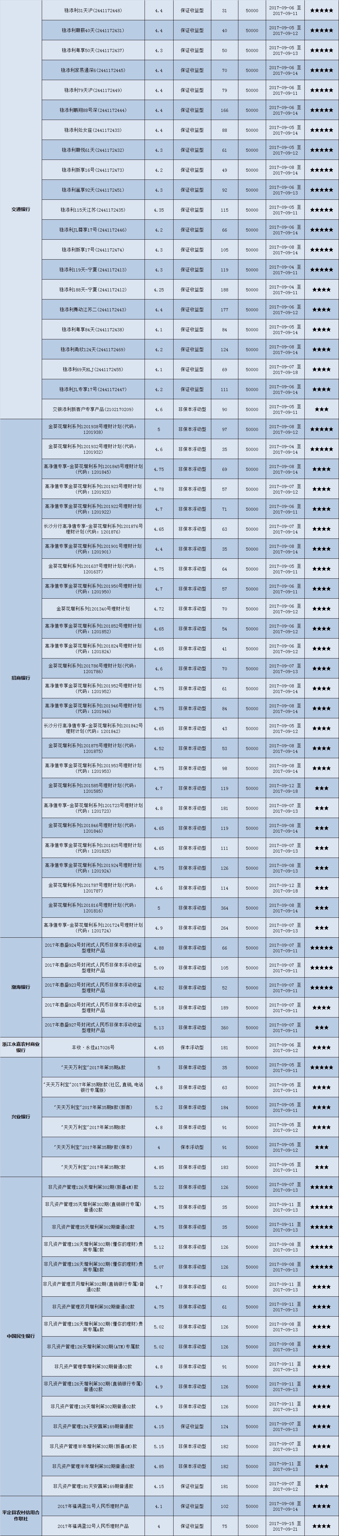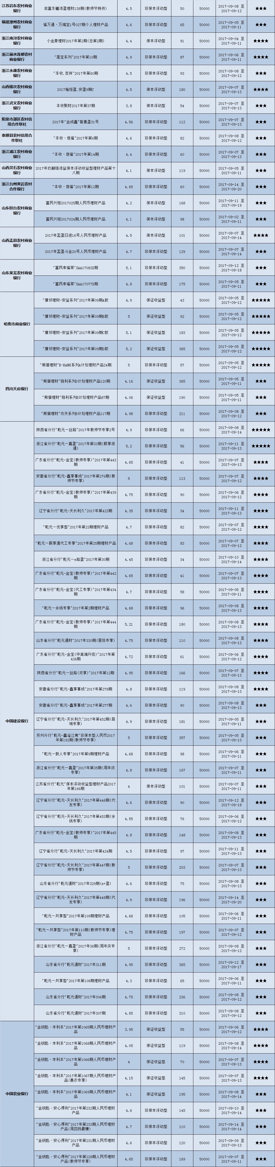 本周投资门槛在10万元至50万元(不含)的产品有142款,平均预期收益为4.83%。其中有106款获得普益标准星级评定,平均预期收益率为4.89%。其中三星产品50款,平均预期收益率为4.84%;四星产品35款,平均预期收益率为4.93%;五星产品21款,平均预期收益率为4.95%。