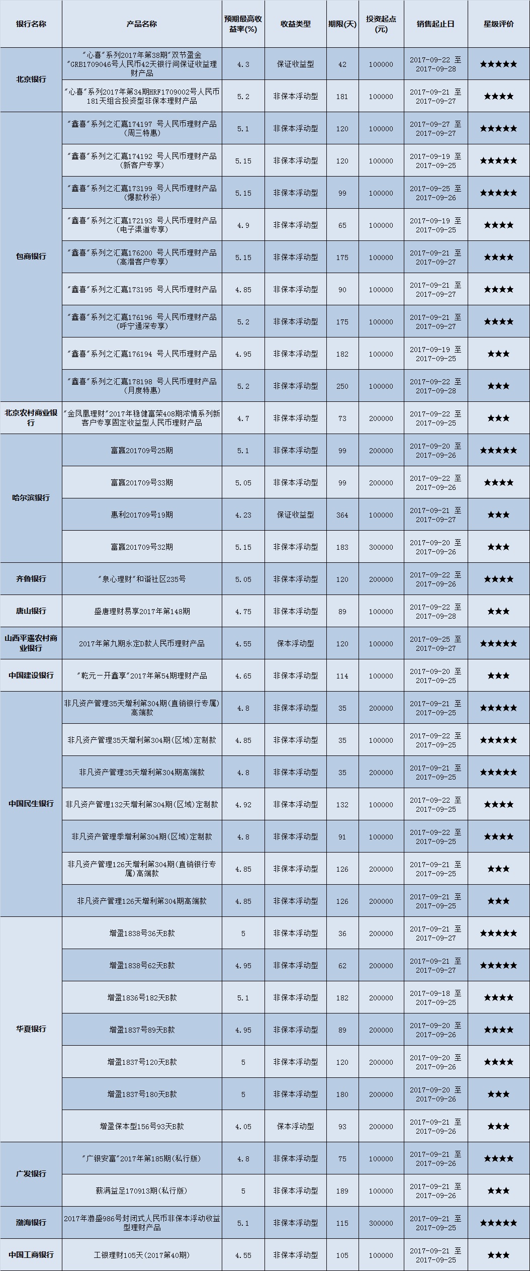 低门槛(10万元以下)理财产品中,华北地区有303款获得普益标准星级评价,平均预期收益率为4.71%。其中三星产品125款,平均预期收益率为4.62%;四星产品110款,平均预期收益率4.69%;五星产品68款,平均预期收益率为4.92%。