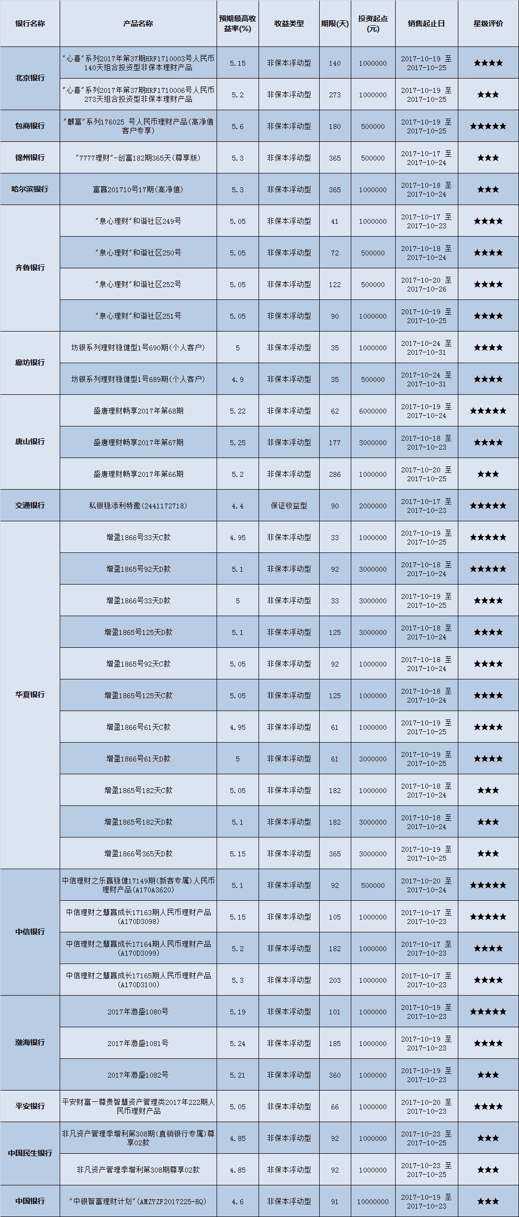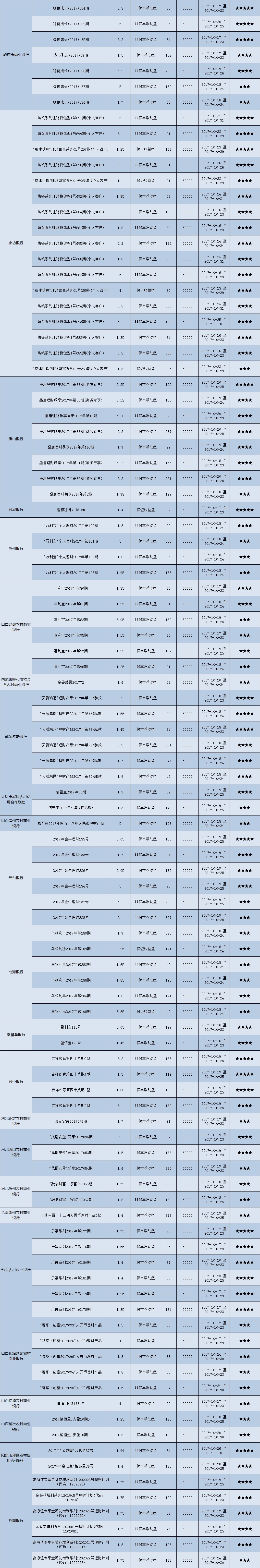 高门槛(50万元及以上)的理财产品中,华北地区有37款获得普益标准星级评定,平均预期收益率为5.08%。其中三星产品11款,平均预期收益率为5.07%;四星产品18款,平均预期收益率为5.08%;五星产品8款,平均预期收益率为5.09%。