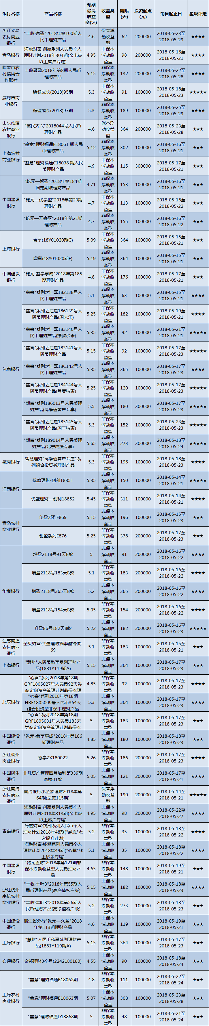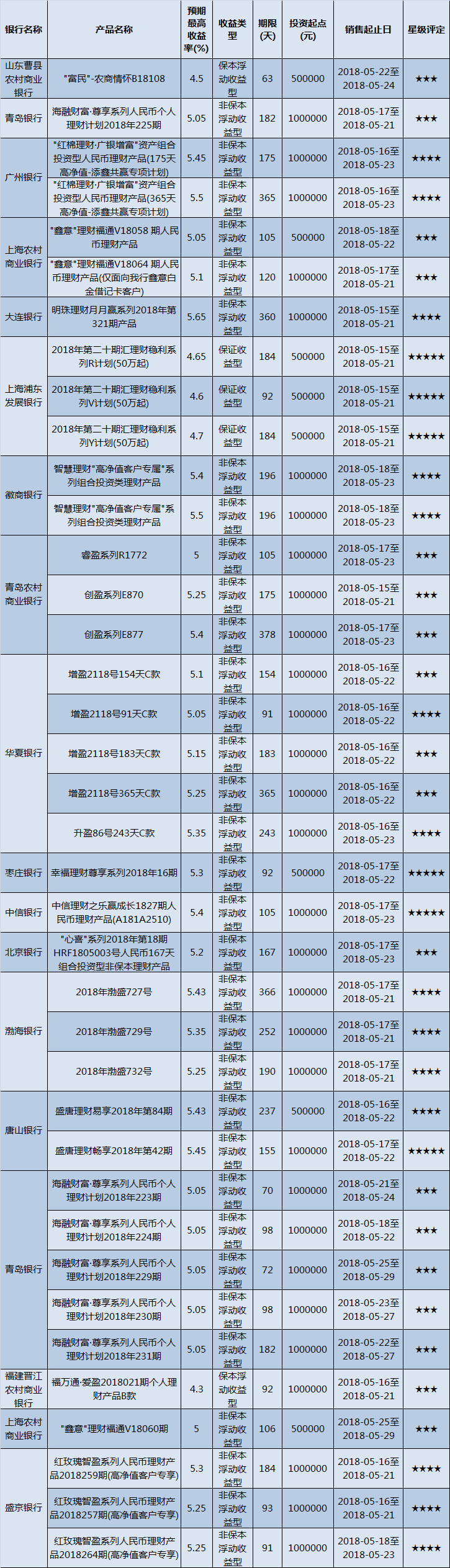 高门槛(50万元及以上)的理财产品中,华东地区有38款获得普益标准星级评定,平均预期收益率为5.15%。其中三星产品18款,平均预期收益率为5.03%;四星产品14款,平均预期收益率为5.37%;五星产品6款,平均预期收益率为5.02%。