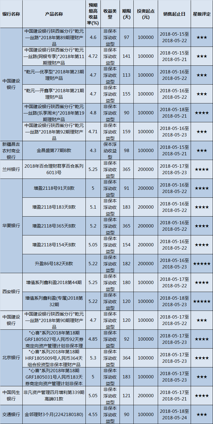 低门槛(10万元以下)理财产品中,西北地区有108款获得普益标准星级评定,平均预期收益率为4.95%。其中三星产品46款,平均预期收益率为4.68%;四星产品29款,平均预期收益率5.12%;五星产品33款,平均预期收益率为5.19%。