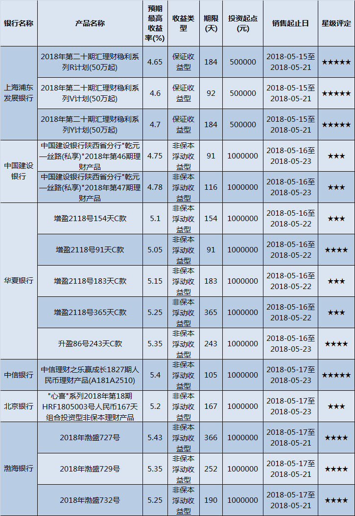 高门槛(50万元及以上)的理财产品中,西北地区有15款获得普益标准星级评定,平均预期收益率为5.07%。其中三星产品6款,平均预期收益率为5.04%;四星产品5款,平均预期收益率为5.29%;五星产品4款,平均预期收益率为4.84%。