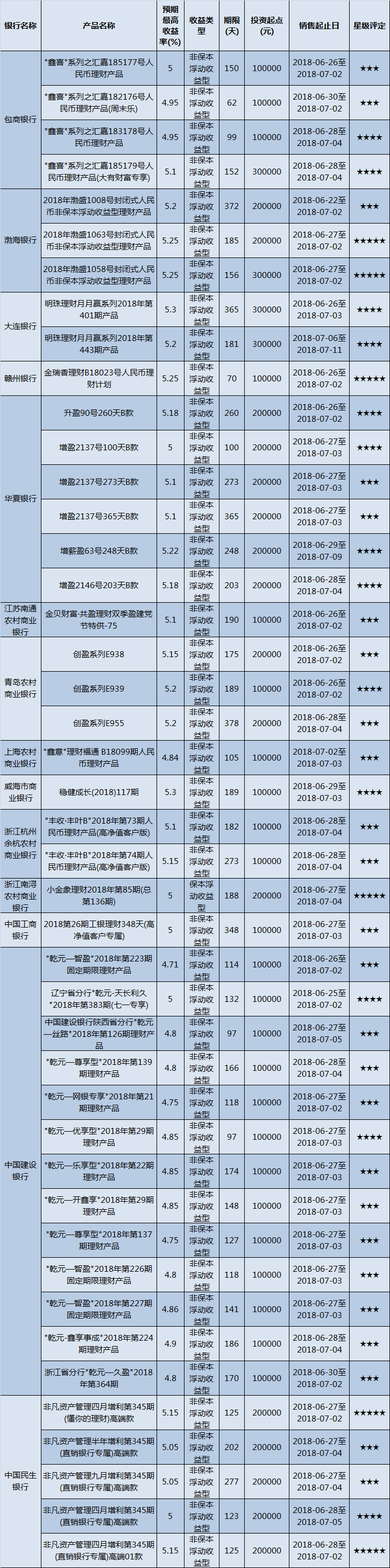 低门槛(10万元以下)理财产品中,华东地区有406款获得普益标准星级评定,平均预期收益率为4.95%。其中三星产品215款,平均预期收益率为4.76%;四星产品114款,平均预期收益率5.08%;五星产品77款,平均预期收益率为5.28%。