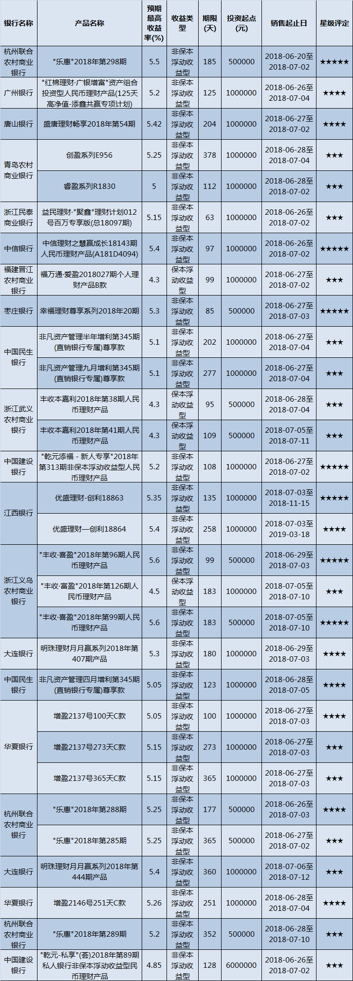 高门槛(50万元及以上)的理财产品中,华东地区有30款获得普益标准星级评定,平均预期收益率为5.13%。其中三星产品15款,平均预期收益率为4.93%;四星产品8款,平均预期收益率为5.24%;五星产品7款,平均预期收益率为5.42%。