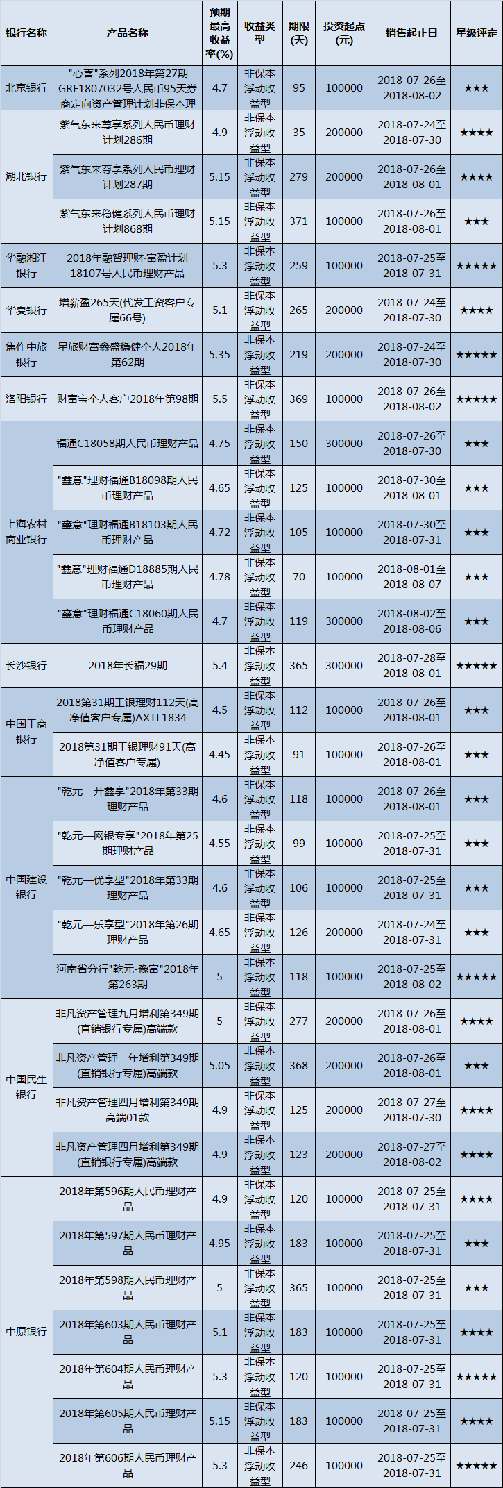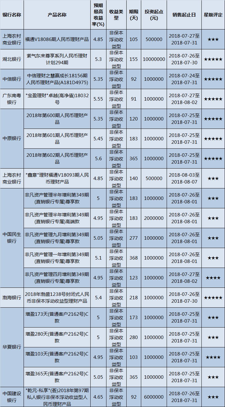 高门槛(50万元及以上)的理财产品中,华中地区有19款获得普益标准星级评定,平均预期收益率为5.13%。其中三星产品10款,平均预期收益率为4.95%;四星产品2款,平均预期收益率为4.95%;五星产品7款,平均预期收益率为5.43%。