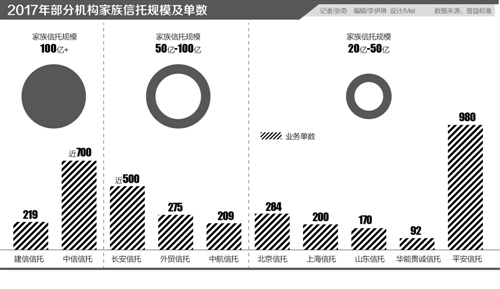 普益标准近日发布的一份报告显示,2017年末,有近30家信托公司开展家族信托业务,存量规模合计超500亿元,存量产品数近3000单。其中,建信信托、中信信托、外贸信托等公司规模居前。