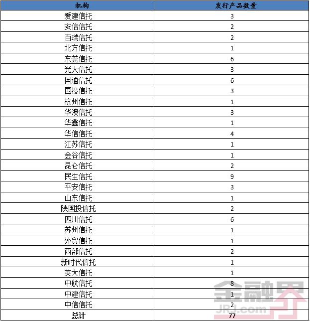 本周共有28家公司发行了77款信托产品,其中民生信托发行量最大,为9只。