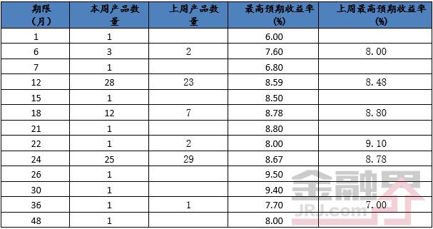 与上周发行的产品对比,24个月的产品数量略有减少,收益率略有下降;12个月的产品发行数量略有上升,收益率略有上升。