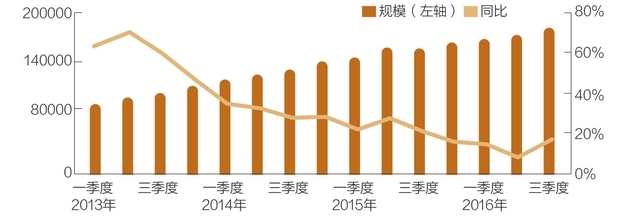自2013年以来,随着互联网金融兴起,各机构如雨后春笋般出现,而PE/VC业态的成熟为互联网金融早期的快速发展提供了资本支撑。“钱荒”持续成为“宝宝理财”快速崛起的导火索,且在宽松的舆论环境下,互联网金融在第三方支付、P2P网贷、众筹、互联网银行、互联网保险、基于大数据的金融服务平台等业务领域取得了飞速发展。而互联网金融的快速崛起本身也产生了一系列的负面因素,来自各方面的影响改变了行业发展环境,互联网金融迎来新的发展阶段。从2013年到2016年,互联网资管规模增速较为稳定,预计至2016年末,规模将达到27732.1亿元。