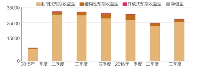 2015年四季度至2016年三季度,全国银行业金融机构共发行理财产品113914款。从运作模式来看,封闭式预期收益型共发行102724款,占比为90.2%;结构性预期收益型共发行9533款,占比为8.4%;开放式预期收益型共发行889款,占比为0.8%;净值型共发行768款,占比为0.6%。环比来看,2016年二季度银行理财产品数量大幅减少,三季度出现回升。全年平均每季度发行理财产品数量为28479款。