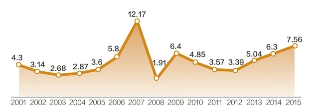 2007年我国保险业受到内在发展需求动力和国民经济高速成长环境的双重推动,此外得利于2007年中国资本市场的良好表现,保险公司投资收益率创历史新高。2008年,由于A股市场暴跌、行业渠道代理手续费恶性竞争以及全球金融危机,在经历了2007年全行业保费和投资收益高速增长的盛宴之后,中国保险投资收益率下滑显著。2015年,在低息环境下,保险产品吸引力显著增加,保单销售持续好转。寿险业正向循环已启动,高投资收益减弱了产品销售难度,进一步提升了保险产品吸引力,寿险业务规模增速加快。此外,股市对保险投资收益率也具有重要贡献。虽然自2015年三季度起,股市反复震荡筑底,但由于在2015年上半年获得了较为丰厚的投资收益率,且及时采取措施控制仓位,因此保险行业在2015年投资收益颇丰。